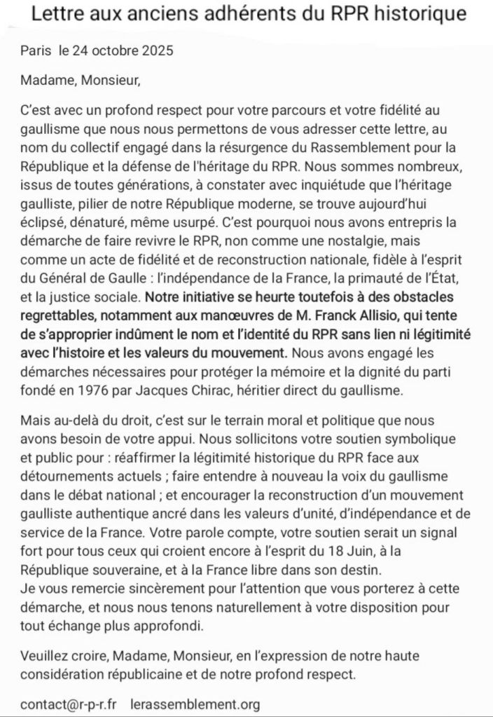 Comme annoncé il y a quelques jours, nous lançons un collectif des anciens adhérents du RPR historique. Celui-ci s’organisera par région et sera coordonné au niveau national par Joao Manuel Péreira. Pour demander à faire parti de ce collectif, il faut avoir été adhérent au Rassemblement Pour la République fondé en 1976.